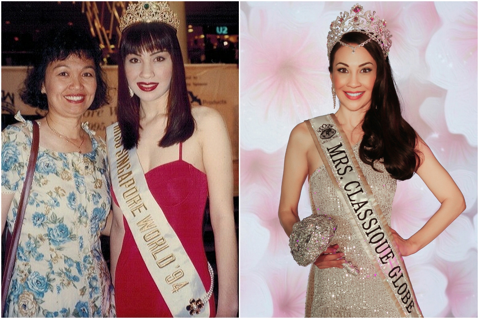 (Left) Ms Angela Lee Pickard with her mother when she won Miss Singapore World in 1994. (Right) Ms Pickard was crowned Mrs Classique Globe on June 4.