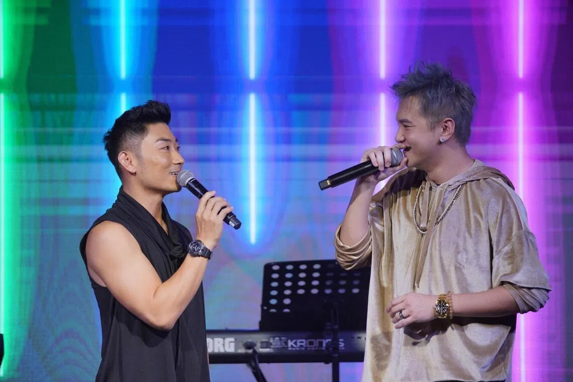 Singaporean singer Alfred Sim (left) and actor Ian Fang (right) performing at the Singapore Chinese Cultural Centre, during a TGIF Music Station performance on March 6, 2020.