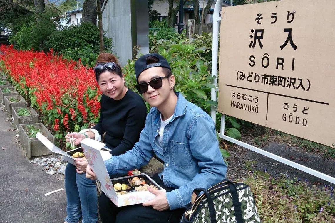 Fang (right) with his mother Ms Fang Pei Pei (left) in Japan filming for the reality travel series Family Wanders (2015).