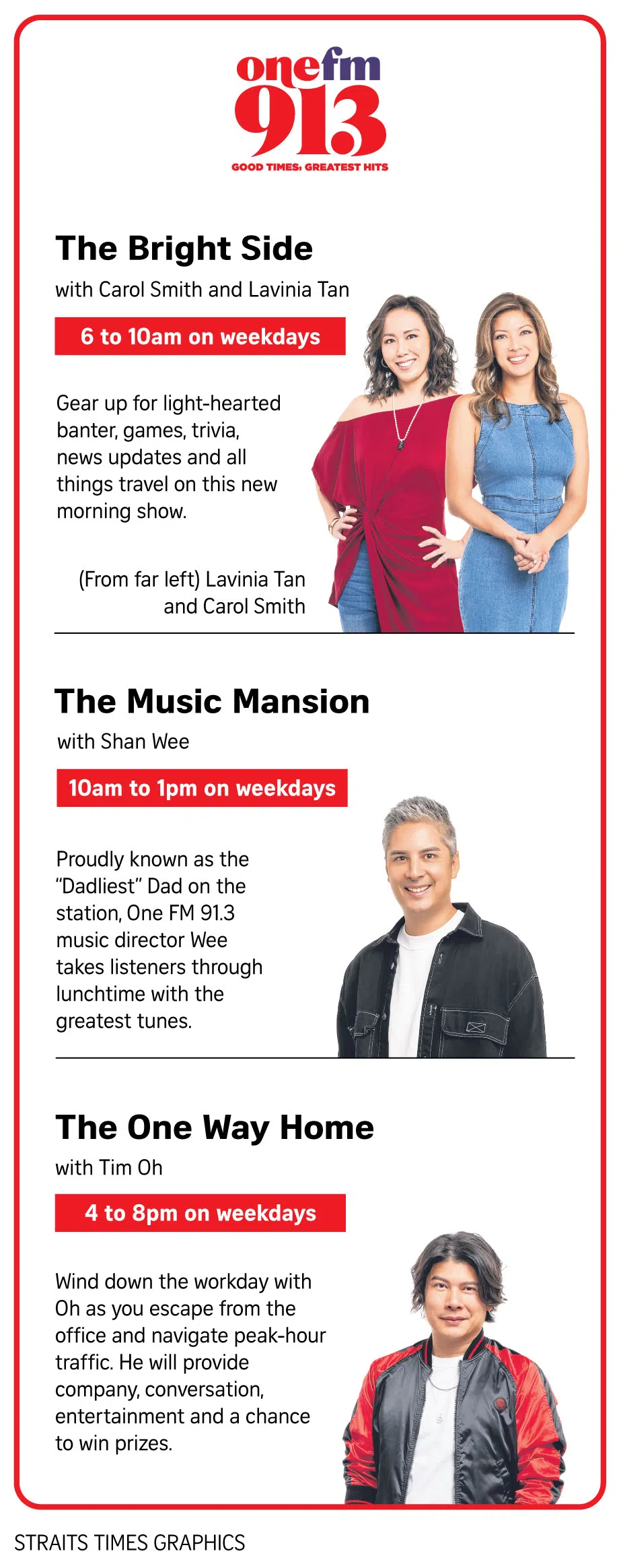 1. The Big Show with Glenn Ong, Angelique Teo and The Flying Dutchman, weekdays, 6 to 10am.