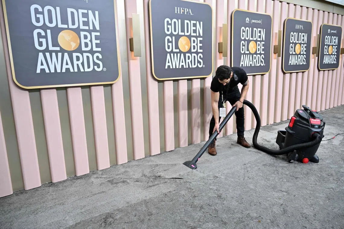 Workers vacuum the carpet ahead the 80th annual Golden Globe Awards.