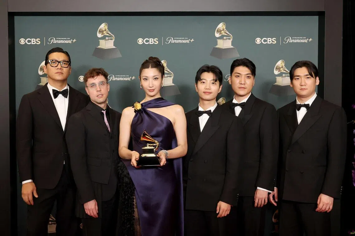 (From left) Seo Jeong-hoon, Mark Sonnenblick, Ejae, Lee Yu-han, Park Hong-jun and Nam Hee-dong, winners of Best Song Written for Visual Media for Golden (from KPop Demon Hunters), pose in the press room during the 68th Grammy Awards on Feb 1.