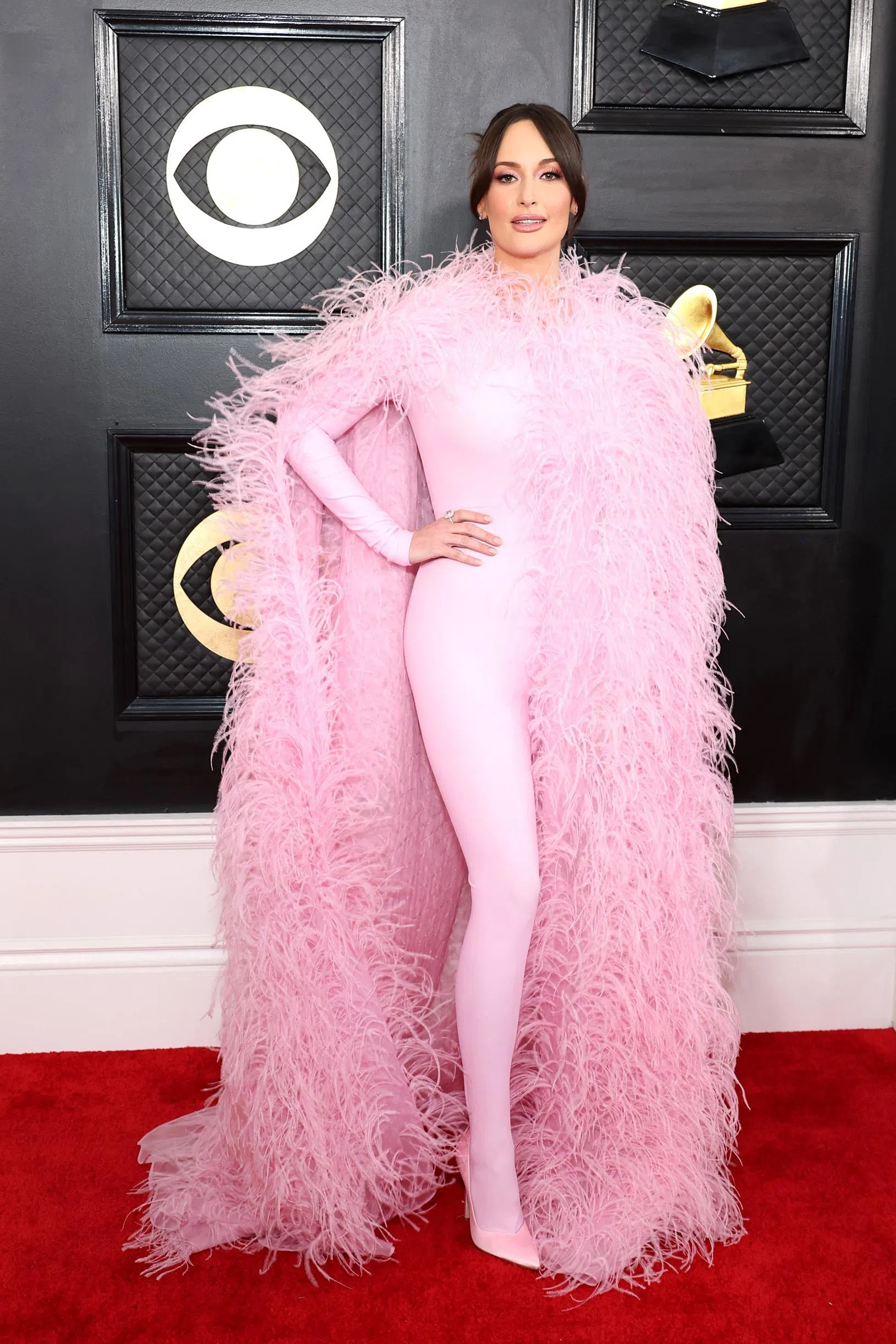 Kacey Musgraves made a statement in top-to-toe pink in a mesmerising bodysuit from Valentino, as well as a floor-sweeping cape made from ostrich feathers.