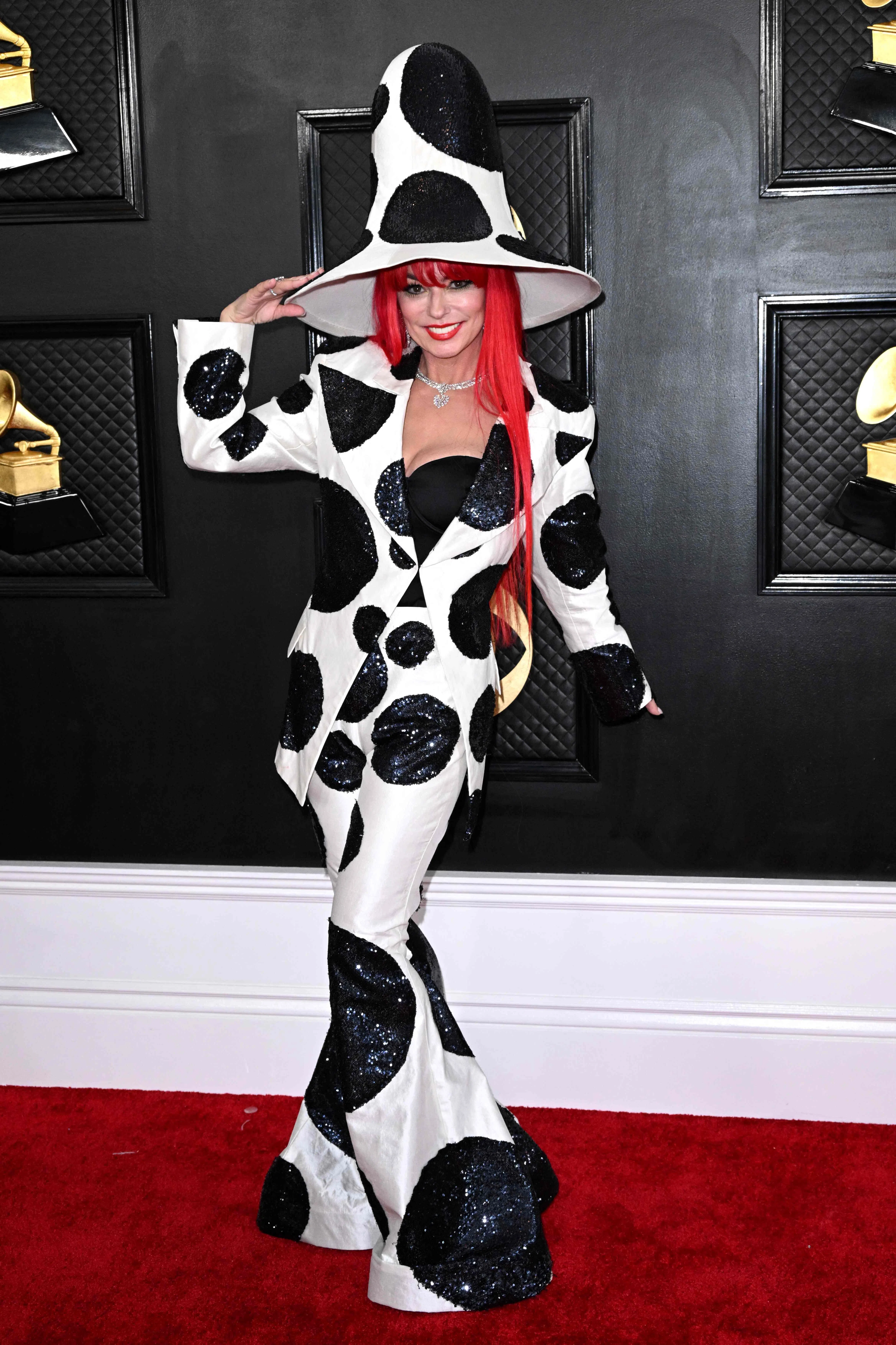 With the cow prints, oversized hat and billowy bell bottoms, the American country singer, who seemed to have drawn her style inspiration from Elsie the Cow, looked like she belonged on a cattle ranch rather than a red carpet.