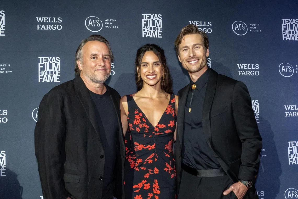 (From left) Director Richard Linklater and actors Adria Arjona and Glen Powell at the event, A Toast To Texas Film: Honoring Glen Powell, in Austin, Texas, in May.