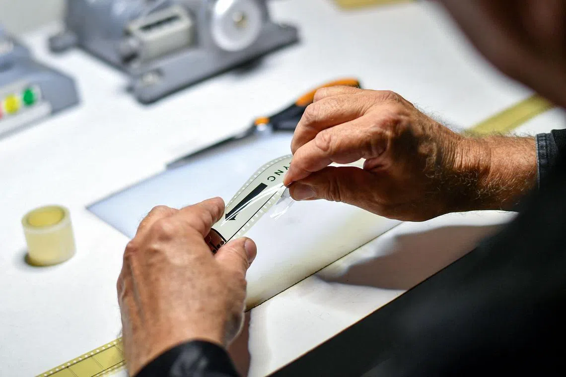 A film specialist checking film at Pro-Tek Vaults, a California-based film preservation specialist.