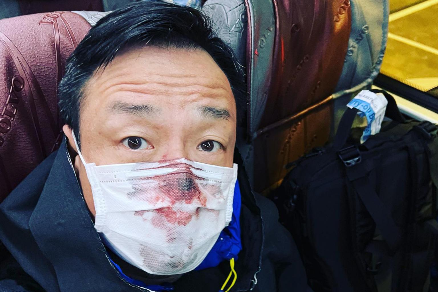 He posted photos of his blood-stained face mask and a short video of him in tears at the airport.