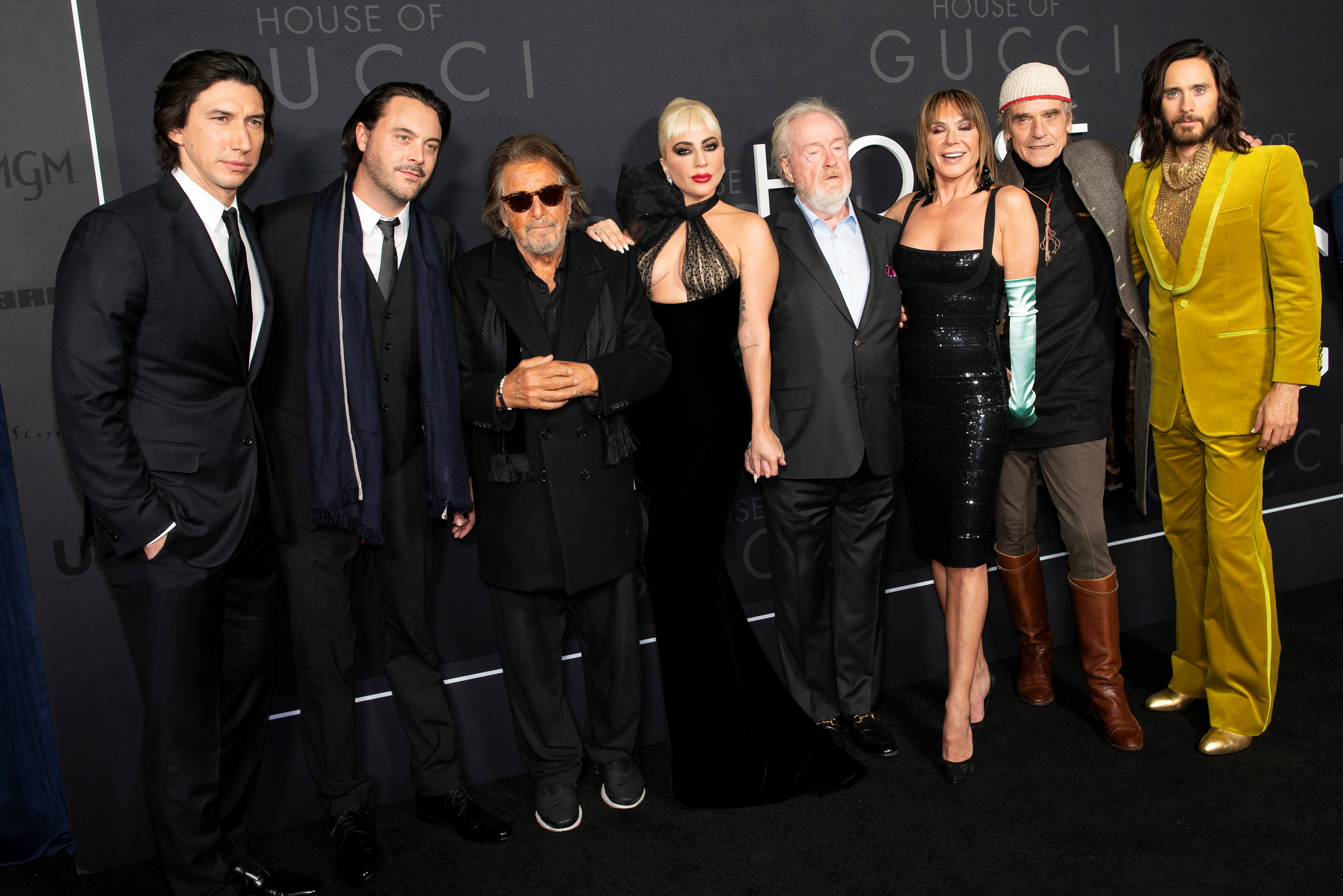 (From left) Adam Driver, Jack Huston, Al Pacino, Lady Gaga, Ridley Scott, Giannina Facio, Jeremy Irons and Jared Leto attend the House Of Gucci premiere in New York City.