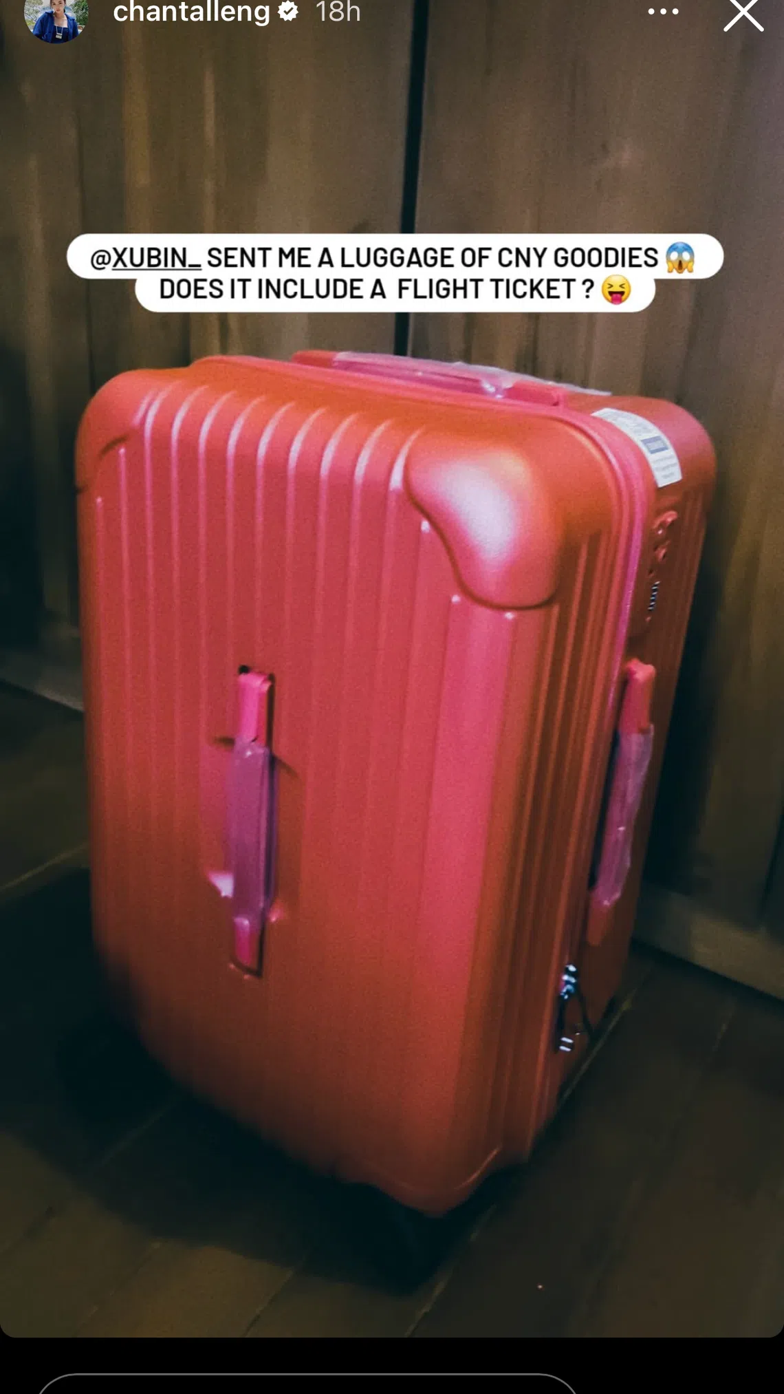Ng, 27, shared a photograph of a striking red suitcase full of “CNY goodies” that he sent her and jokingly asked in the caption: “Does it include a flight ticket?”