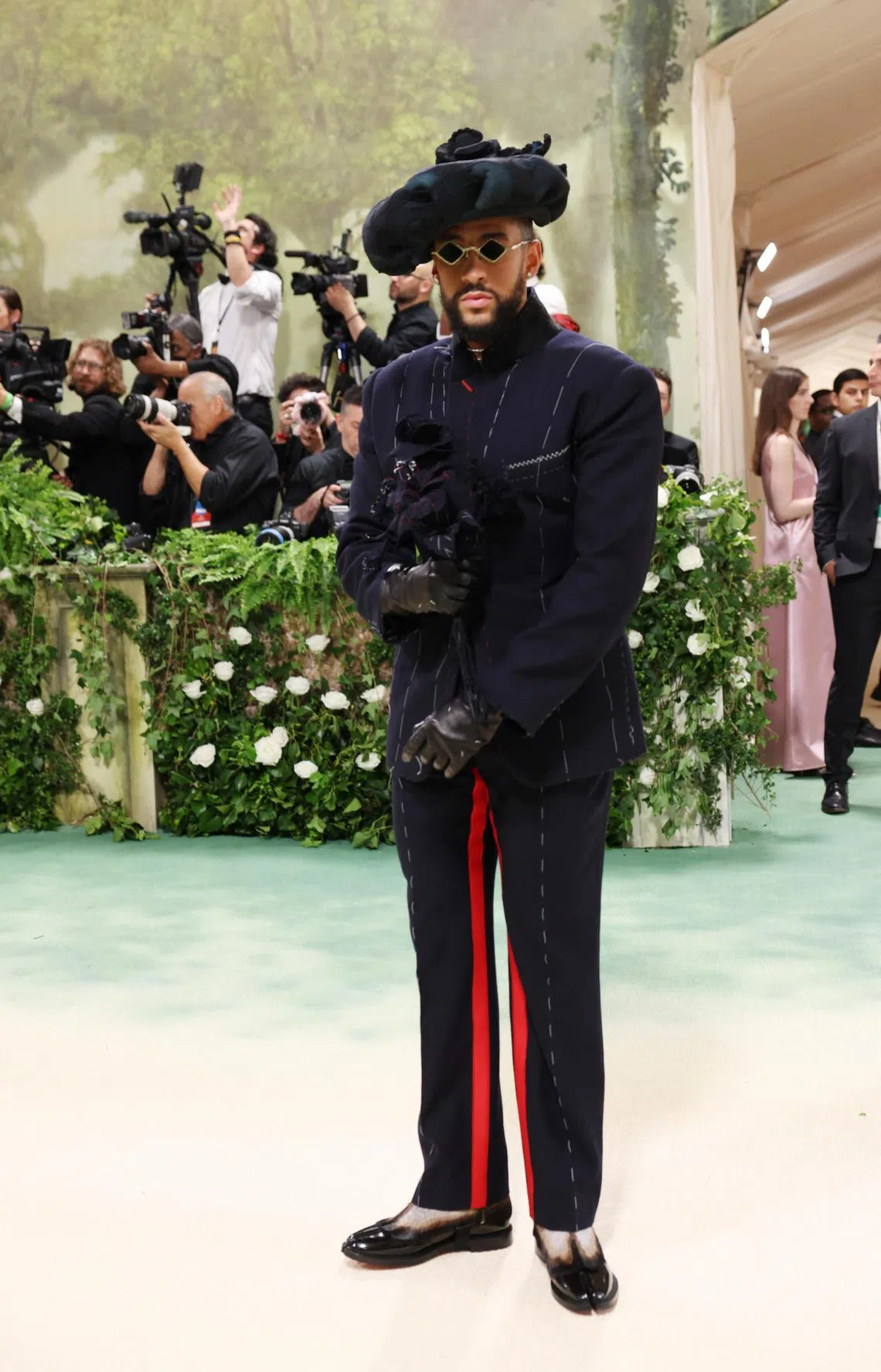 Puerto Rican singer Bad Bunny evoked a kind of Tudor matador with a sweeping hat and a black bouquet, with the only pop of colour his bright red inseam and the patent shine of his cloven shoes.
