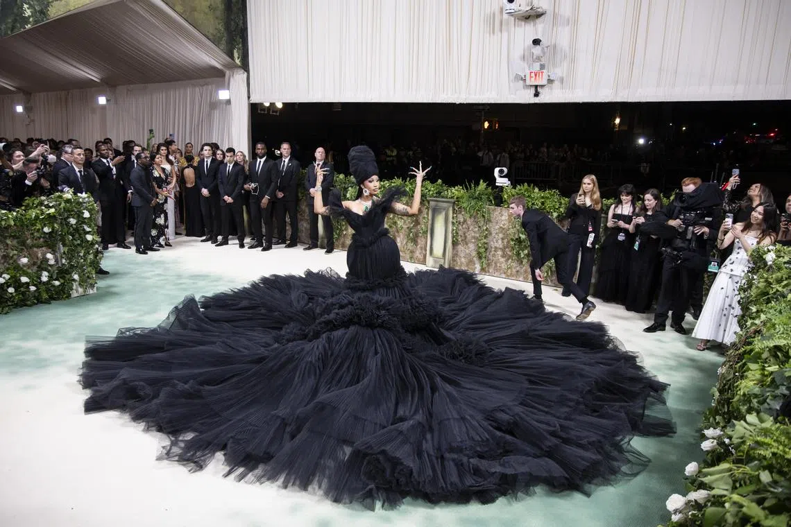 American rapper Cardi B was resplendent in funereal black, with a train so expansive it required nine men to lift it up the stairs. “It’s a black rose,” she told journalists.
