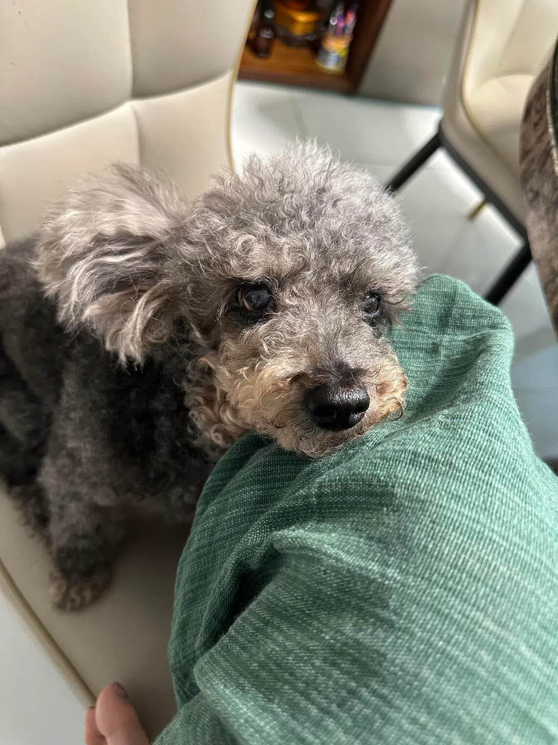Waffles is a male 10-year-old maltipoo who senses Julie Tan's moods well.