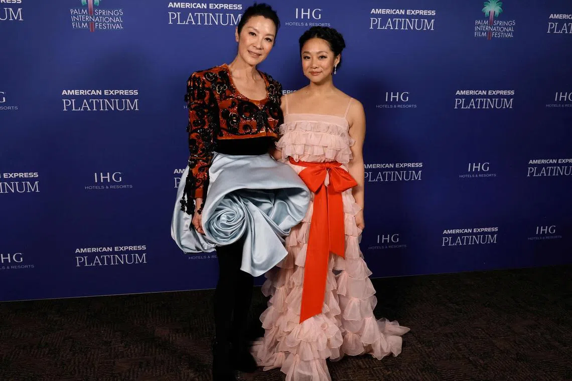 Actresses Michelle Yeoh (left) and Stephanie Hsu at the 2023 Palm Springs International Film Festival Awards Night Gala in California, on Jan 5, 2023.
