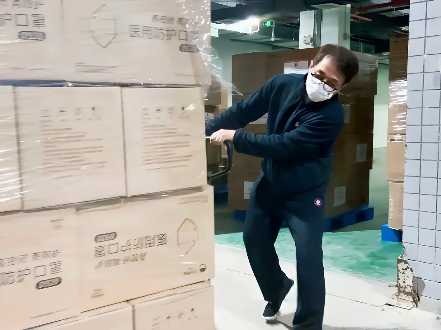 In photos posted by a fan account, Jackie Chan was seen helping to move cartons of medical supplies to be sent to Hong Kong.