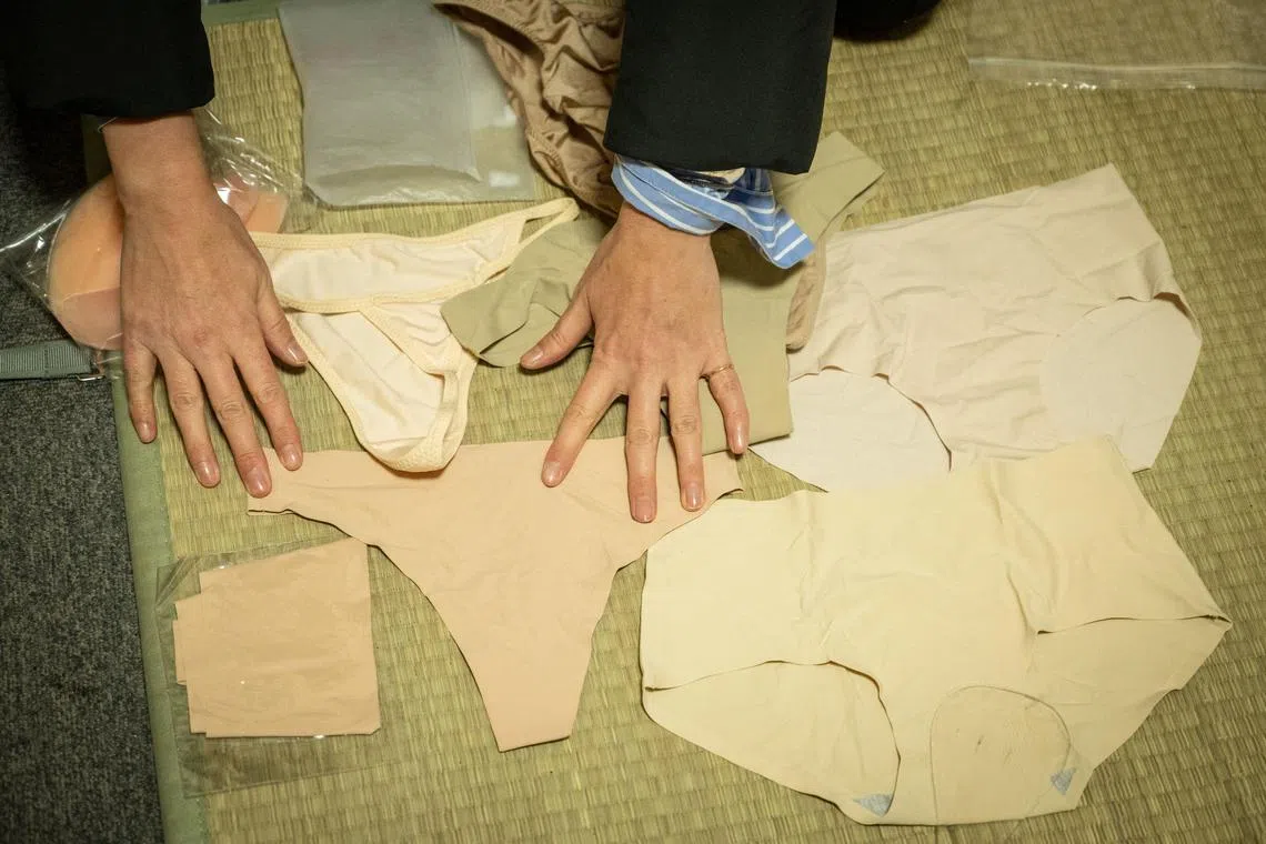 Intimacy coordinator Momoko Nishiyama displaying underwear in different skin tone shades used for intimate scenes on the set of a TV drama in Kawasaki.