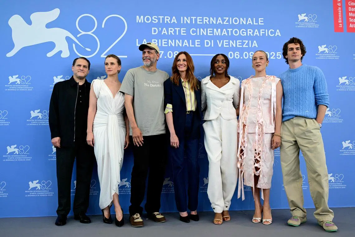 (From left) Actor Michael Stuhlbarg, writer Nora Garrett, director Luca Guadagnino, actress Julia Roberts, actress Ayo Edebiri, actress Chloe Sevigny and actor Andrew Garfield at the photo call of After The Hunt at the 82nd Venice Film Festival on Aug 29.