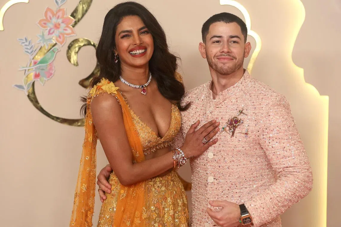 Indian actress Priyanka Chopra and her husband, US singer Nick Jonas, posing for photographs as they arrive for the ceremony.