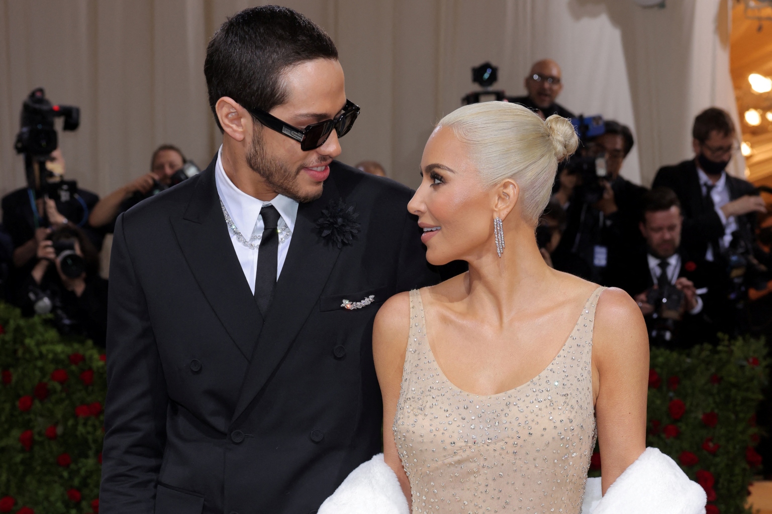 Kim Kardashian (right) and Pete Davidson arrive at New York's Metropolitan Museum of Art for the Met Gala on May 2, 2022.