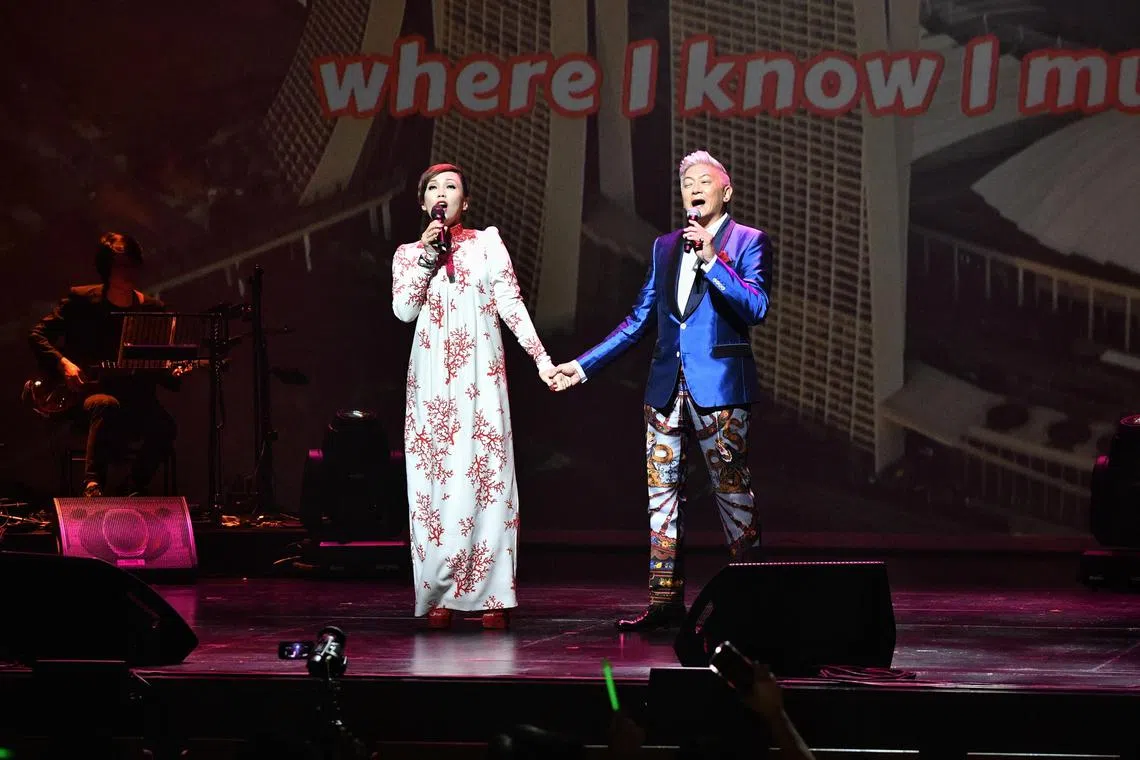 Kit Chan (left) and Dick Lee leading a singalong of Home at the finale of the Dover Park Hospice Sunflower Charity Concert on Oct 20, 2022.