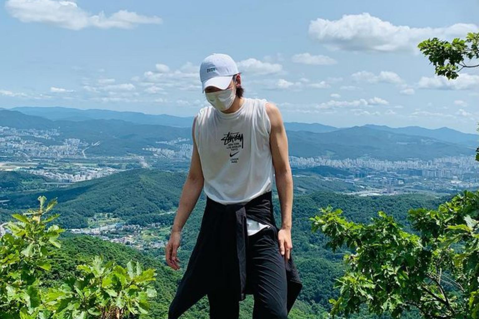 On Sunday (Aug 15), the popular South Korean actor, 34, posted a series of photos on Instagram of him hiking up a mountain with a face mask.