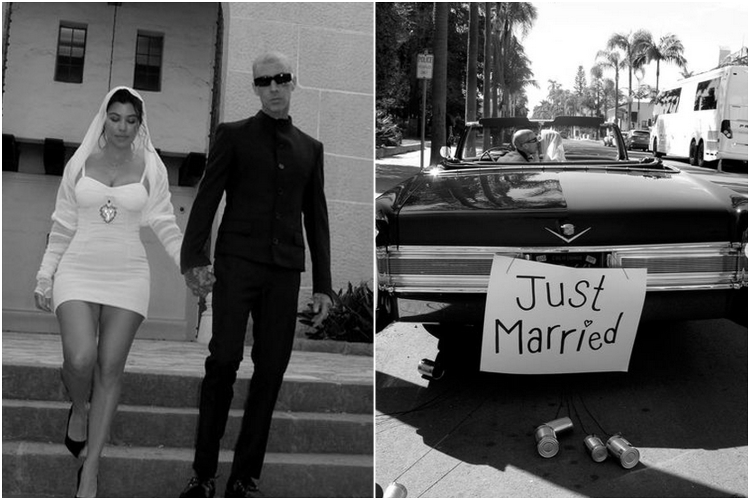 Kardashian, 43, shared eight photos, including one of them kissing in a car with the words "Just Married" hanging from the bumper.