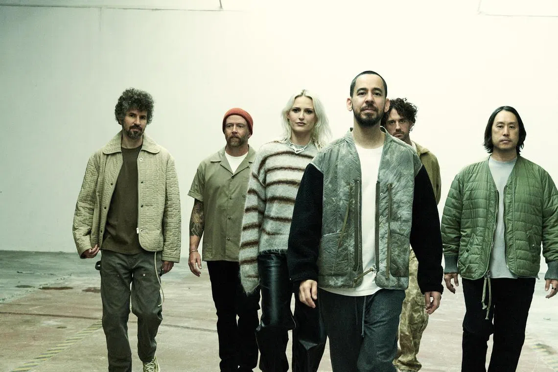 American band Linkin Park comprise (from left) Brad Delson, Dave Farrell, Emily Armstrong, Mike Shinoda, Colin Brittain and Joe Hahn.
