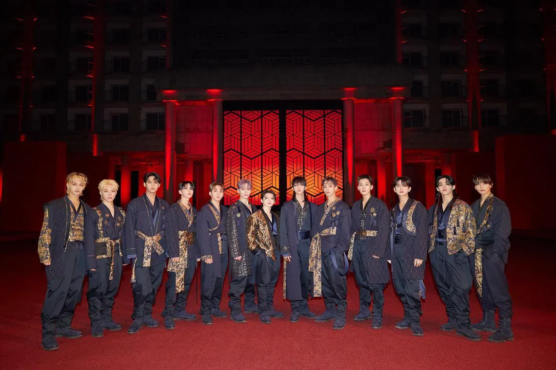 The members of Seventeen – (from left) Jun, Dino, Mingyu, Hoshi, Seungkwan, Vernon, Woozi, The8, DK, Wonwoo, Joshua, S.Coups and Jeonghan.