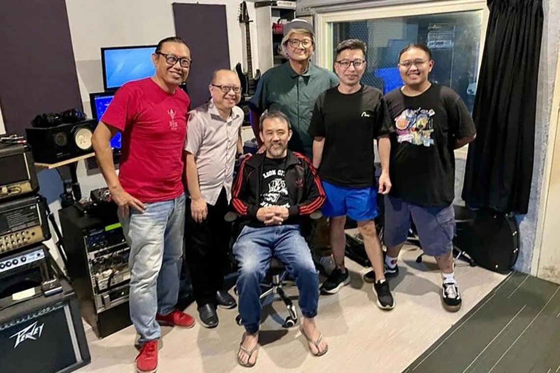 Singapore indie rock veterans The Oddfellows with Mr K.K. Wong (seated), owner of music studio TNT Music Productions, and music video director Syamsul Bahari (right).