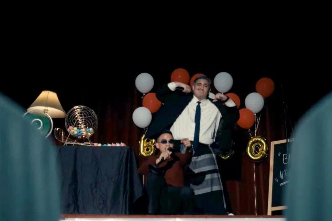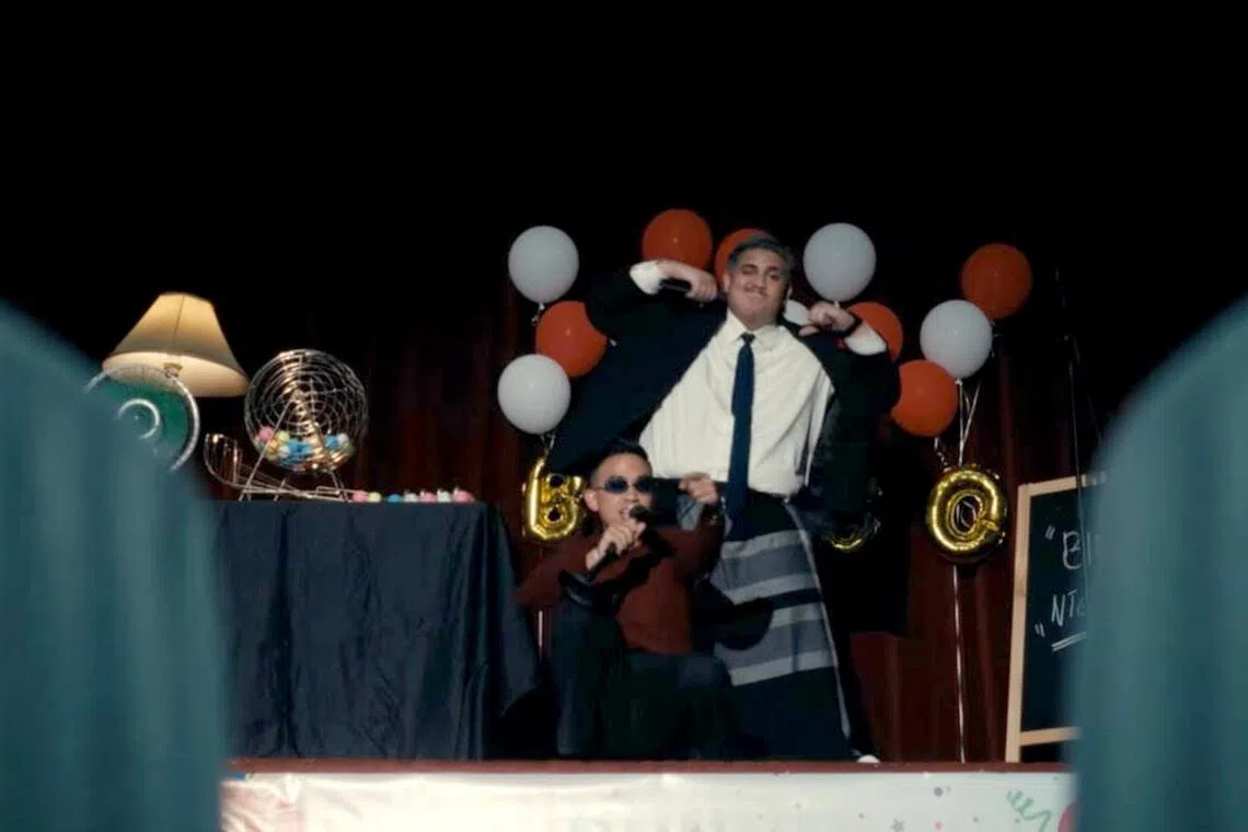 Singapore hip-hop musicians Alyph (left) and Abangsapau perform at a bingo night in the music video for Boom Bada Bada.