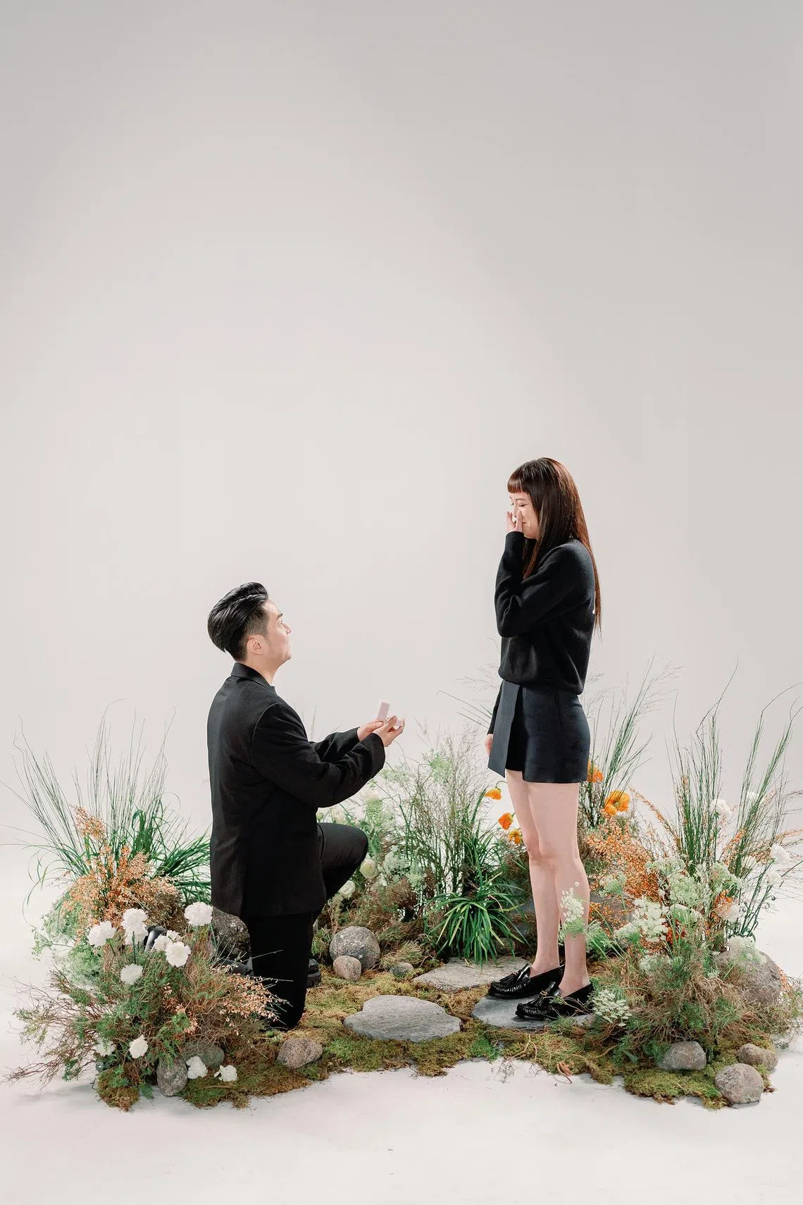Wu, who staged a surprise proposal for Tay, got her to go to a photo studio under the pretext of a solo photo shoot for her conducted by a mutual photographer friend. Midway, a projector began playing a video montage of the couple’s time together, before Wu walked in with a bouquet of flowers and asked her to marry him.