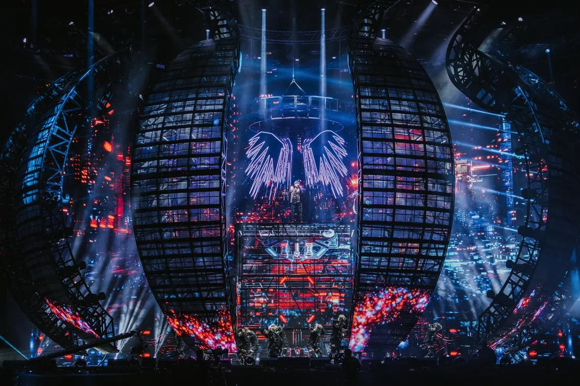 He is raised on a platform from beneath the stage to a height, while a pair of glowing wings is lowered from the ceiling, allowing him to appear as an angelic warrior, poised for the fight.