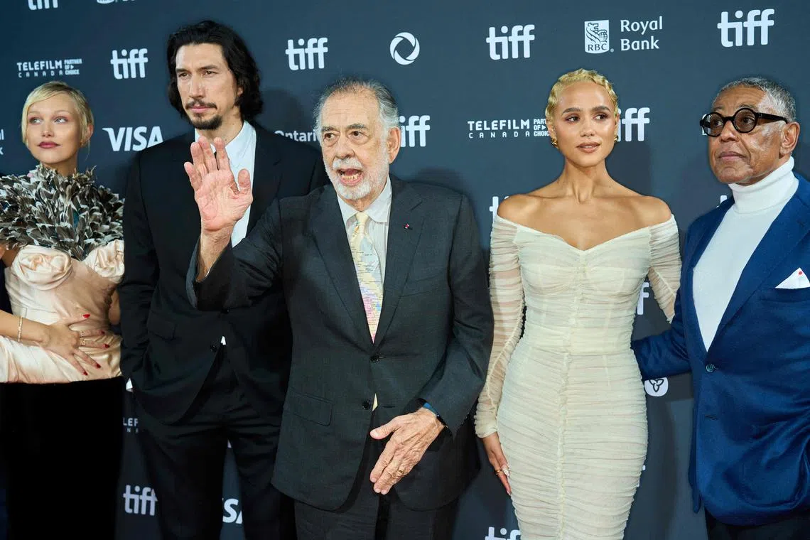 Film-maker Francis Ford Coppola with (from left) actors Grace VanderWaal, Adam Driver, Nathalie Emmanuel and Giancarlo Esposito at the world premiere of Megalopolis during the Toronto International Film Festival on Sept 9.