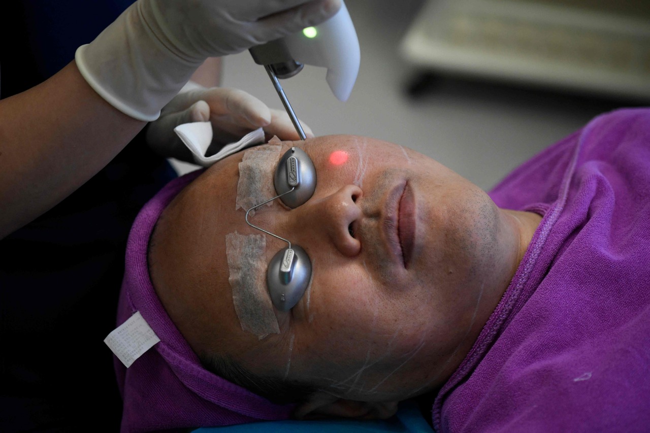 <p>This picture taken on August 25, 2021 shows Wu Wenyun, president of a plastic surgery clinic, receiving skin care treatment at his clinic in Beijing. - The vast majority of men who have had cosmetic treatments in China had their first cosmetic procedure before the age of 30 in a flourishing private sector offering a wide range of treatments. (Photo by WANG ZHAO / AFP) / TO GO WITH China-social-surgery-gender,FEATURE by Leo Ramirez and Qian Ye</p>