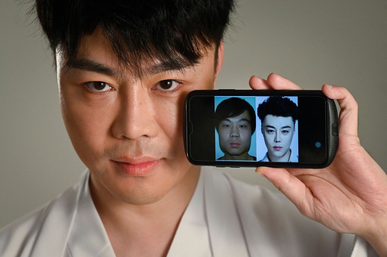 <p>This picture taken on July 20, 2021 shows Chinese actor Nai Wen showing before and after photos of himself after cosmetic surgery, at a photo studio in Beijing. - Nai Wen has had more than 60 cosmetic procedures on his face, including non-invasive laser therapies. (Photo by WANG ZHAO / AFP) / TO GO WITH China-social-surgery-gender,FEATURE by Leo Ramirez and Qian Ye</p>