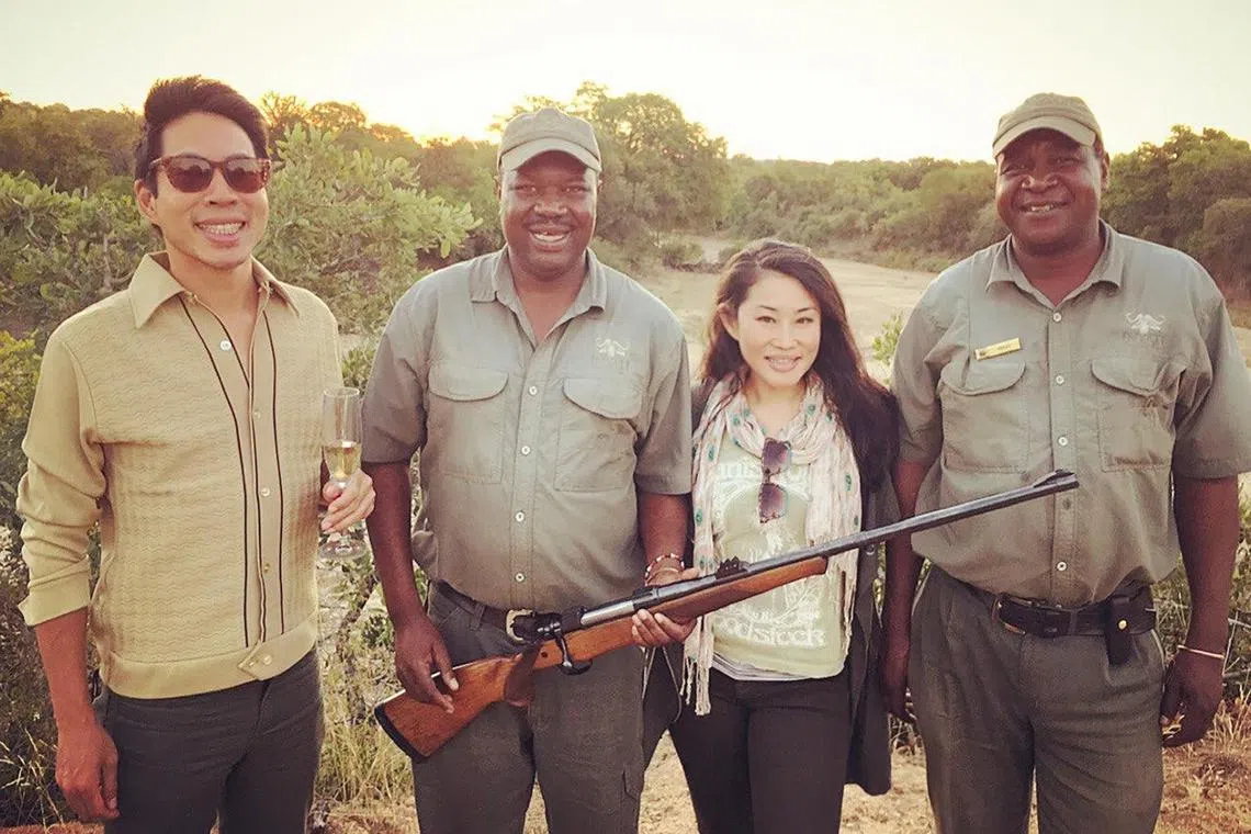 Chua Enlai and his friend Denise Tan with safari guides at the Sabi Sand Game Reserve in South Africa in 2016.