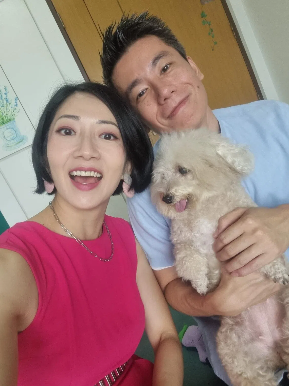 Jo Tan (left) at home with her husband Edward Choy and their adopted dog, Wobbles Woo.