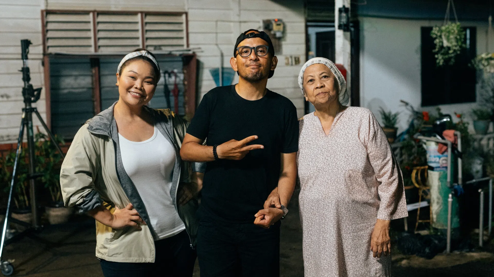 (From left) Siti Khalijah, M. Raihan Halim and Zaliha Hamid on the set of iZ-1, one of six short films from the SG60 anthology film Kopitiam Days.