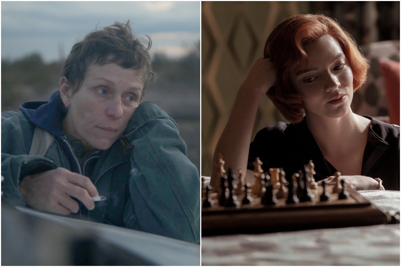 Nomadland (left) and The Queen's Gambit won the Best Motion Picture and Best Television Limited Series awards respectively.