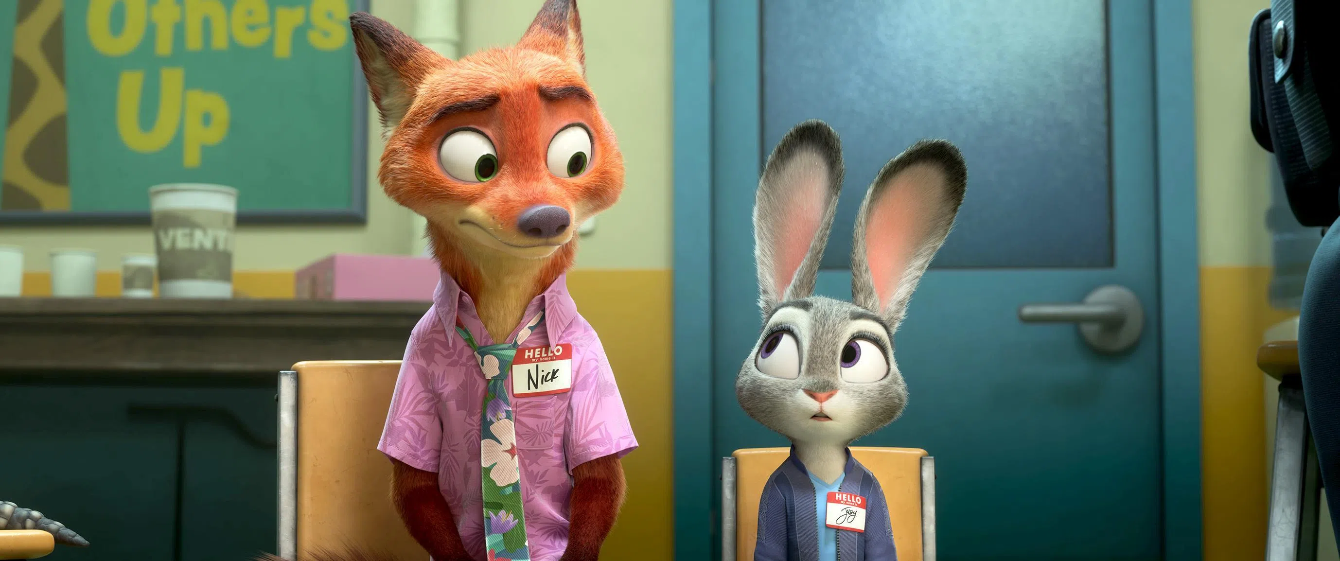 Nick Wilde (left, voiced by Jason Bateman) and Judy Hopps (voiced by Ginnifer Goodwin) in Zootopia 2.