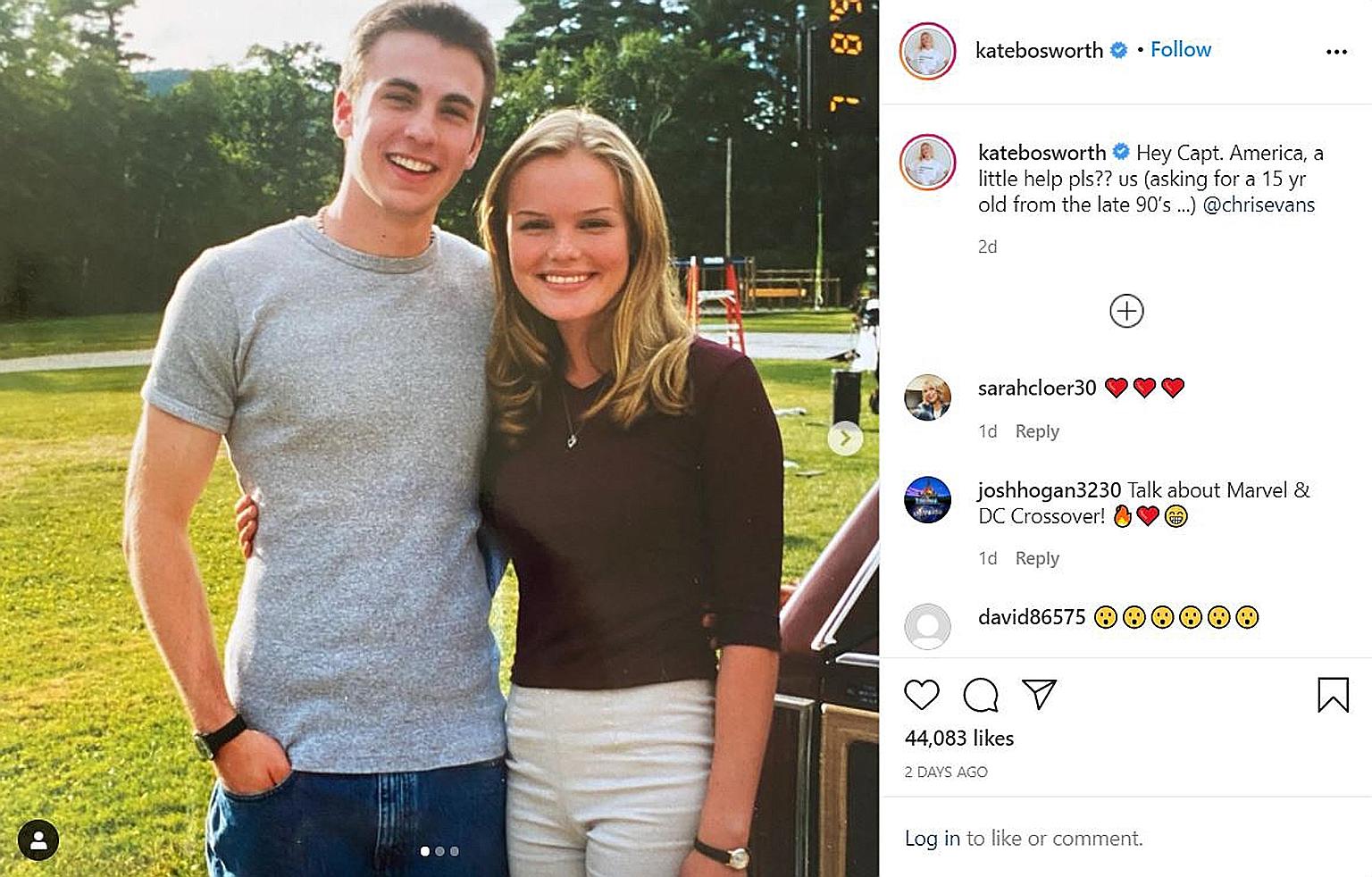 WILL HE OR WON'T HE?: Decades before Chris Evans, 39, became the beloved superhero Captain America, he played an all-American boy next door, as seen in throwback photos posted by actress Kate Bosworth.