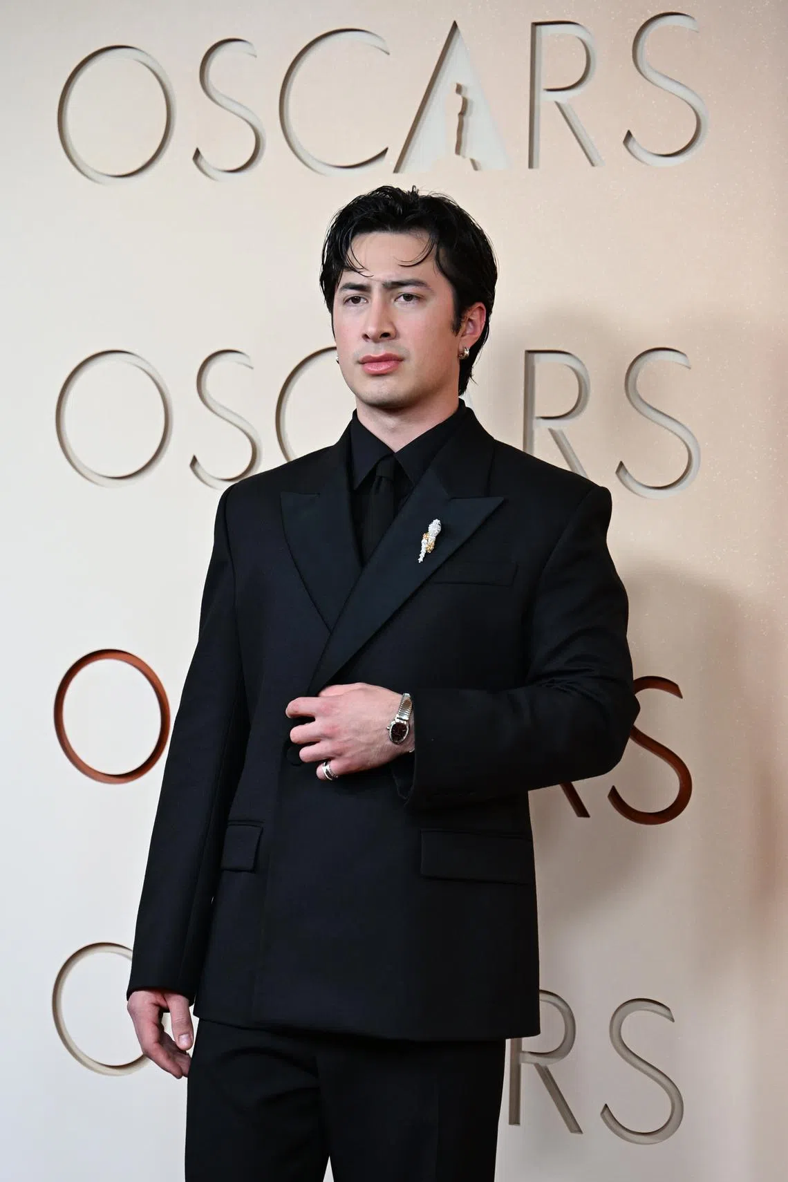 American actress Chase Infiniti, who plays actor Leonardo DiCaprio’s daughter in One Battle After Another, while not an Oscar nominee, oozed glamour in a lilac sleeveless Louis Vuitton dress with a fitted bodice and a cascade of ruffles tumbling from her hip to the floor, creating a long train.