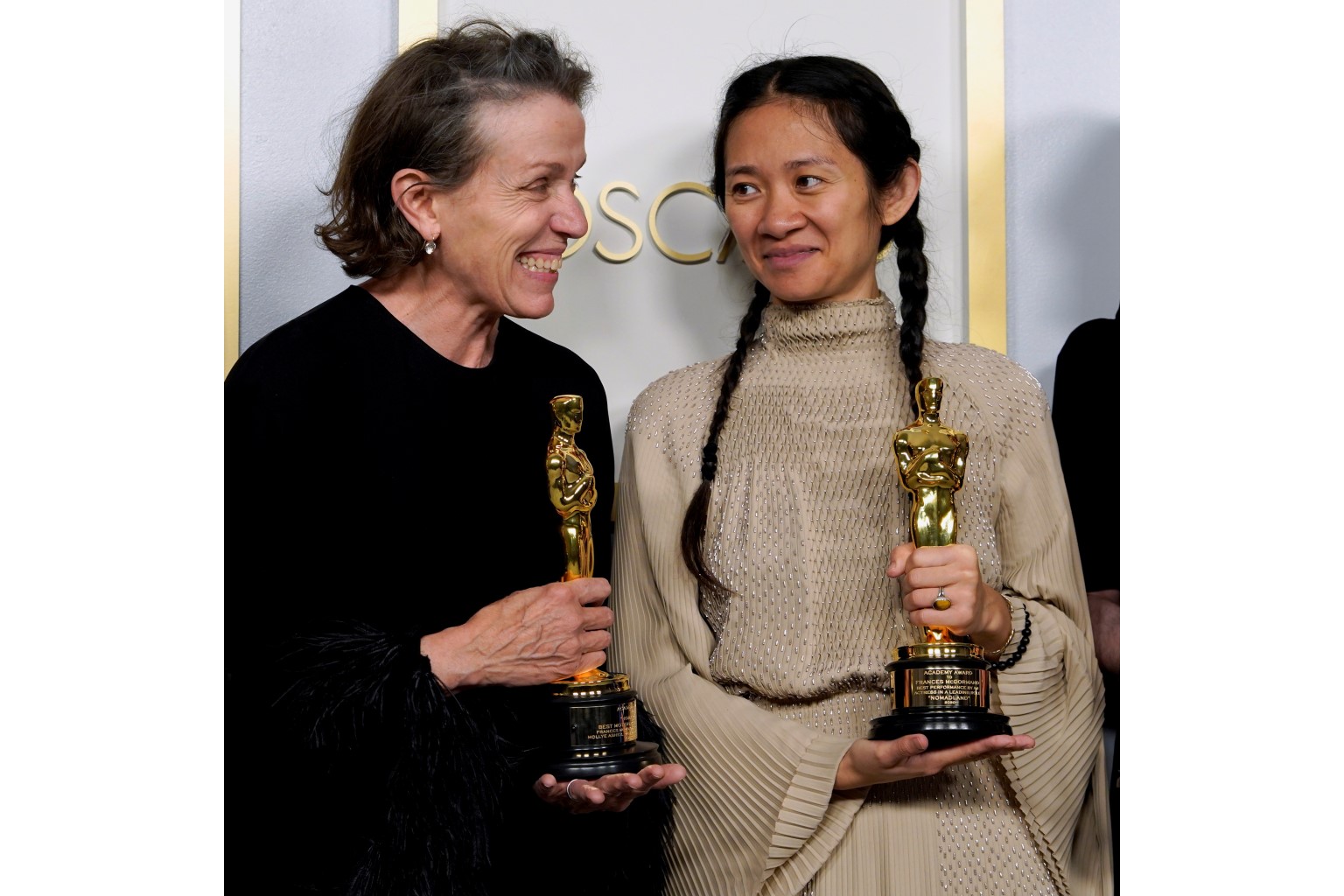 Best Actress winner Frances McDormand and Best Director winner Chloe Zhao, for their film Nomadland, at the 93rd Academy Awards in Los Angeles, California, on Sunday.
