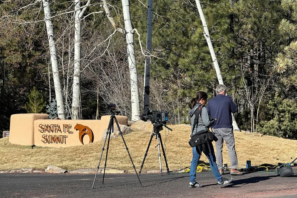 Reporters gathering on Feb 27 outside the entrance to the Santa Fe gated community where actor Gene Hackman, his wife and dog were found dead a day earlier.