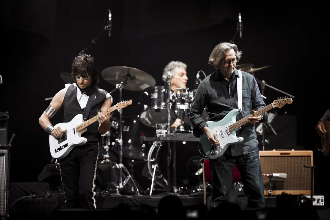 Jeff Beck (left) performs with Eric Clapton at Madison Square Garden in New York during their world tour on Feb 18, 2010.