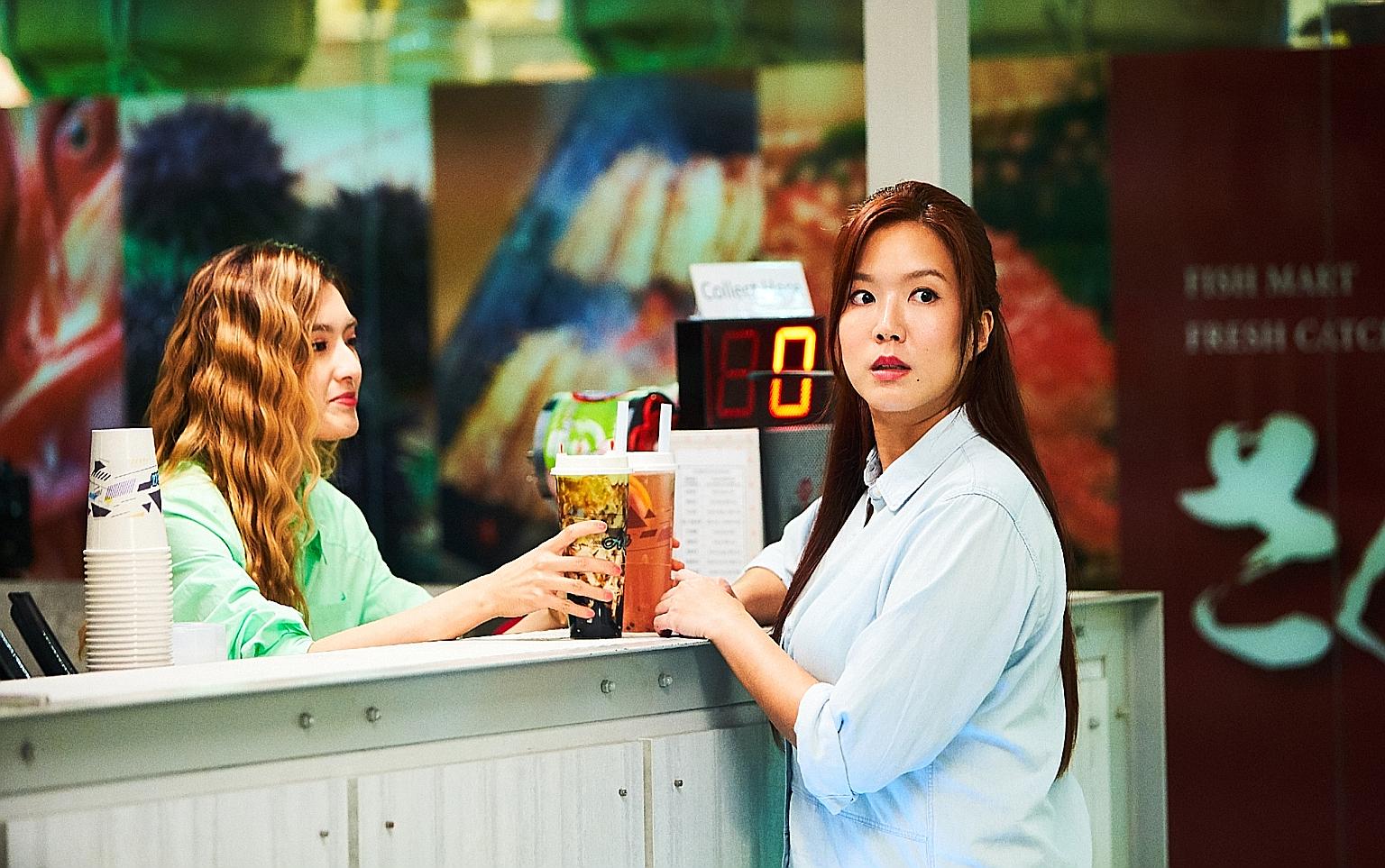 Hong Ling (left) and Rui En (right) at a bubble-tea stall in Mister Flower.