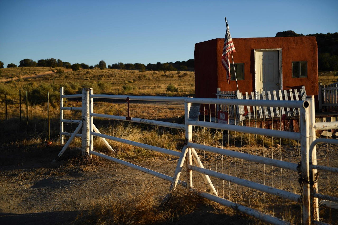 A photo from Oct 29, 2021, shows the entrance to the Bonanza Creek Ranch where Rust was filming, in Santa Fe, New Mexico.
