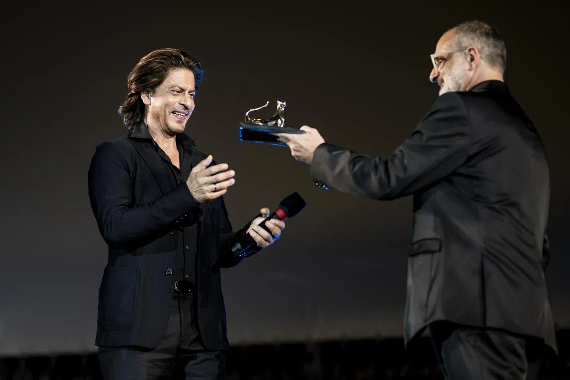 Indian actor Shah Rukh Khan (left) receives the Pardo alla Carriera Ascona-Locarno Tourism award, the festival’s career achievement award, from Locarno Film Festival artistic director Giona Nazzaro.