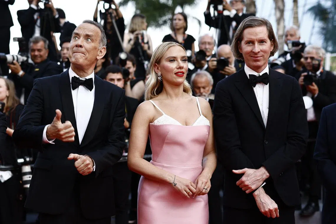 Asteroid City’s director Wes Anderson (right) with the film’s cast members Tom Hanks (left) and Scarlett Johansson at its screening at the 76th Cannes Film Festival on May 23.