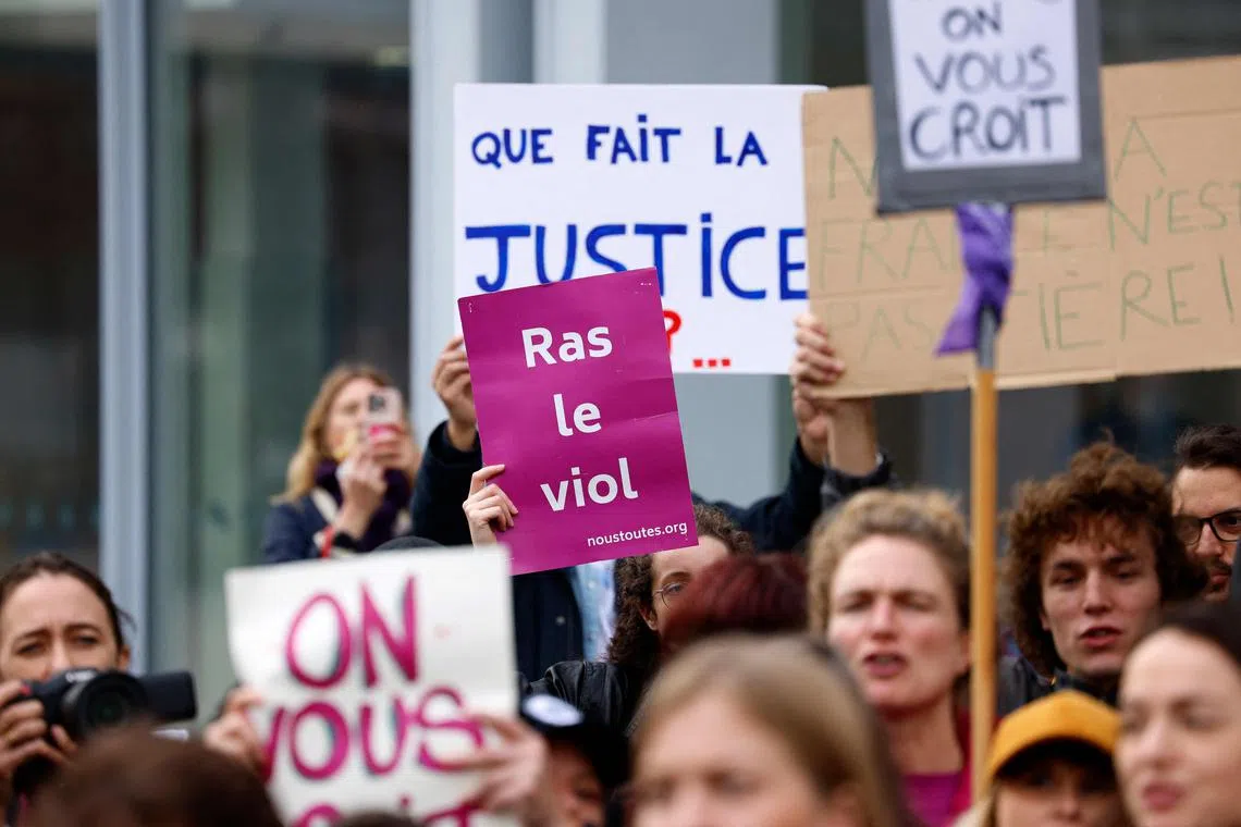 Protesters holding slogans which read “Fed up with the rape” and “We believe you” outside the court in Paris, on Oct 28.