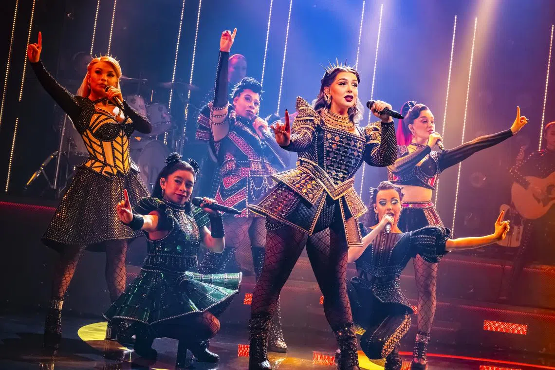 Actresses Liberty Stottor, Erin Summerhayes, Lorren Santo-Quinn (far back), Milly Willows (in foreground), Eloise Lord and Lizzie Emery portray the six wives of Henry VIII in the Singapore season of musical Six.